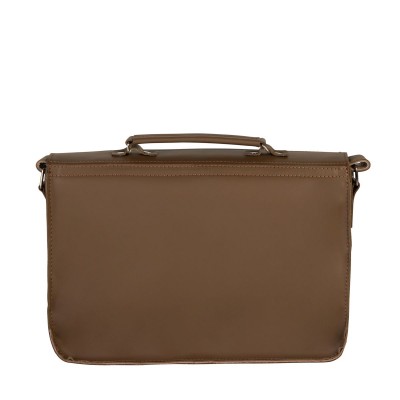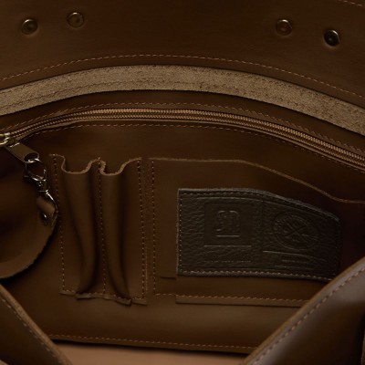 Torba skórzana na ramię Oly w ciemnym beżu to elegancki model z naturalnej skóry. Posiada klapę na zatrzask, kieszeń pod nią oraz funkcjonalne wnętrze: kieszeń na zamek, smyczkę na klucze, 2 miejsca na długopisy i małą kieszonkę. Można nosić w dłoni lub na ramieniu dzięki regulowanemu paskowi do 125 cm.