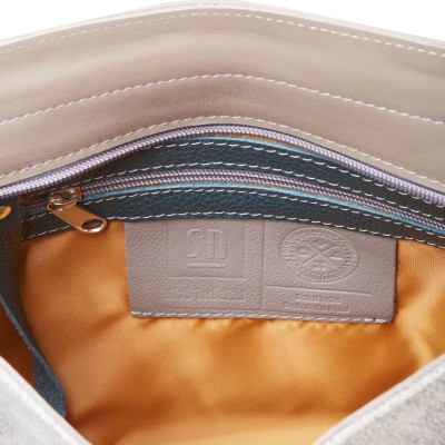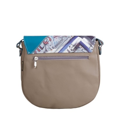 Stylowa torebka casual, która ma kształt półokręgu, a jej podstawa wykonana jest z beżowej skóry naturalnej. Klapa listonoszki została wykonana z połączenia różnego rodzaju naturalnej skóry ozdobnej o różnej fakturze oraz wzorach. Komora główna jest bardzo pojemna, do torebki przymocowany jest pasek regulowany przy pomocy klamerki. Główna komora listonoszki jest zamykana na suwak, mieści format A5. Całość jest zamykana na magnes, ukryty pod ozdobną klapą. Z tyłu torebki skórzanej jest dodatkowa mała kieszonka zamykana na zamek.