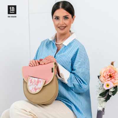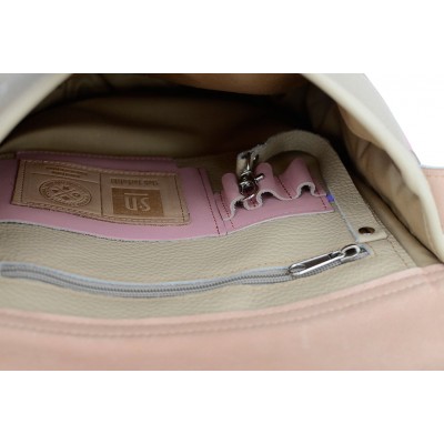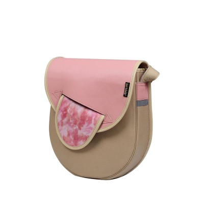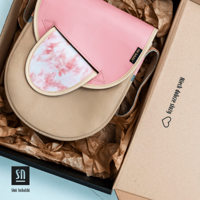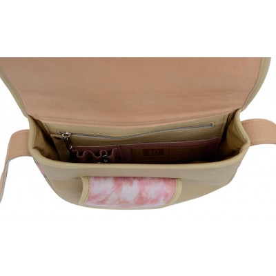Torebka posiada beżową podstawę ze skóry naturalnej oraz różową klapę, tworząc harmonijne połączenie kolorów. Zapięcie na ozdobny język przewlekany przez klapę z naturalnej skóry ozdobnej z różowym motywem dodaje jej niezwykłego uroku.