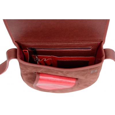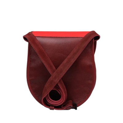 Torebka posiada bordową podstawę ze skóry naturalnej welurowej oraz czerwoną klapę ze skóry licowej, które tworzą niezwykłe połączenie kolorów. Zapięcie na ozdobny język przewlekane przez klapę dodaje jej unikalnego charakteru, a naturalna skóra ozdobna z czerwonym motywem nadaje torebce jeszcze większej atrakcyjności.