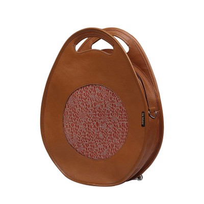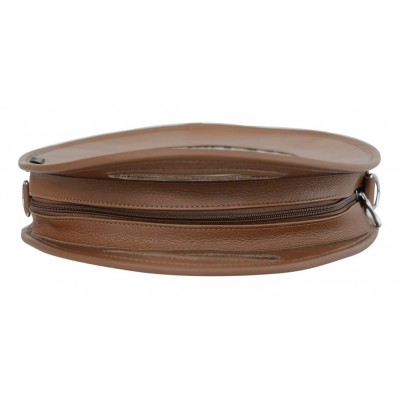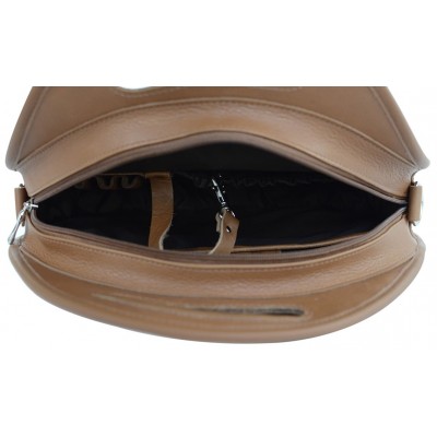Brązowa torebka o zaokrąglonym kształcie z ozdobną skórzaną wstawką - może pełnić funkcję plecaka po przepięciu paska. Średniej wielkości torebka skórzana mieści format A5. Posiada wygodny uchwyt oraz regulowany skórzany pasek.