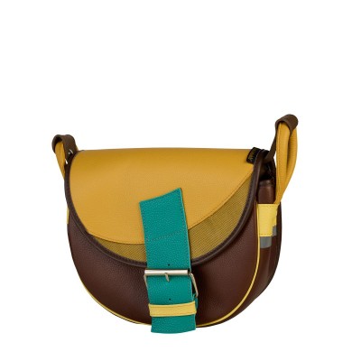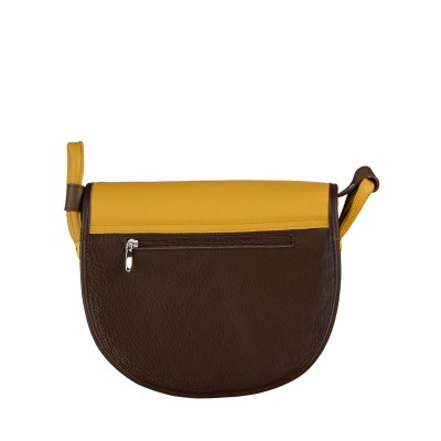 Półokrągła listonoszka ze skóry naturalnej. Ciemnobrązowa podstawa, żółta klapa z wstawką w kolorze starego złota. Zamek główny + magnes pod paskiem z klamrą. Regulowany pasek, tylna kieszeń na zamek, odblaski po bokach. Wnętrze: kieszeń na zamek, smycz na klucze, miejsca na długopisy, mała kieszonka, podszewka. Mieści format A5.