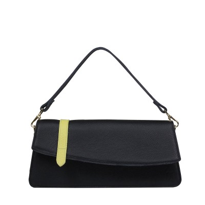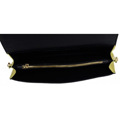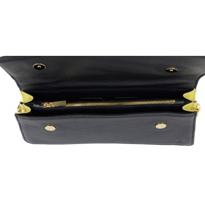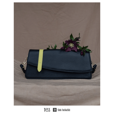 Torebka kopertówka skórzana Tess, wykonana z czarnej licowej skóry naturalnej, z kontrastowym kanarkowym skórzanym paskiem i boczkami. Kopertówka posiada dwa wymienne skórzane paski: krótki do ręki oraz długi na ramię lub crossbody. Asymetryczna klapa z ozdobnym skórzanym paseczkiem, mocny kontrast oraz harmonijkowe wnętrze z dwoma skórzanymi komorami sprawiają, że torebka jest funkcjonalna i elegancka – idealna na specjalne okazje.