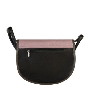 Półokrągła torebka skórzana A5, wykonana z naturalnej skóry groszkowej w kolorze czarnym. Klapa w brudnym różu z lakierowaną, tęczową wstawką, zapinana na magnes pod koralowym paskiem z klamrą i dodatkowo na zamek. Regulowany pasek popielaty, odblaski po bokach, tylna kieszeń na zamek. Wnętrze: kieszeń na zamek, smycz na klucze, 3 miejsca na długopisy, kieszonka na bilet/kartę, podszewka. Stylowa, praktyczna i całoroczna.
