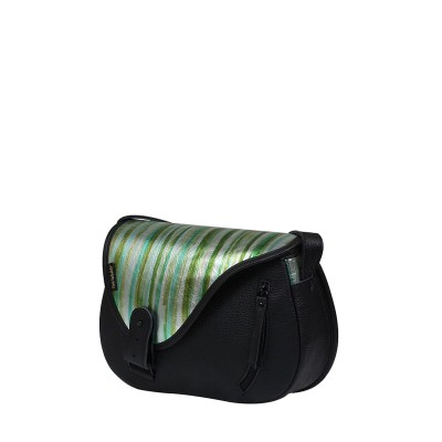 Średniej wielkości torebka damska handmade ze skóry naturalnej. Podstawa torebki wykonana z czarnej skóry licowej. Komora główna mieści format A5 i jest zamykana na suwak, dzięki czemu zawartość jest bardzo dobrze zabezpieczona. Klapa jest wykonana ze skóry dekoracyjnej w odcieniach zieleni. Na przodzie torebki znajduje się zasuwana kieszeń na drobiazgi. Całość uzupełnia nietypowe zapięcie: czarny język ze skóry naturalnej z bolczykiem. Wymiary: 27,5x21x8 cm.