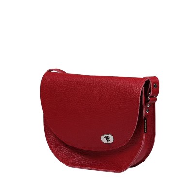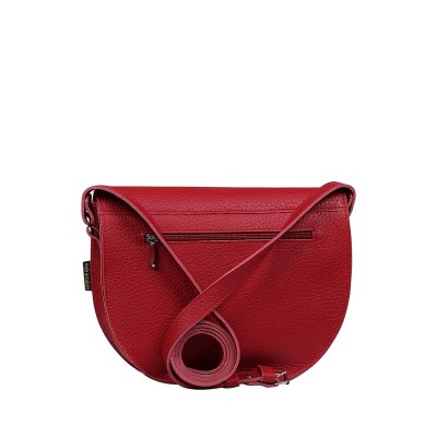 Torebka damska czerwona mała z paskiem o półokrągłym kształcie. Podstawa wykonana ze skóry licowej w kolorze czerwonym. Klapa jest zamykana pomocą zapięcia typu przekrętka. Z tyłu torebki znajduje się zabezpieczona kieszeń na suwak.