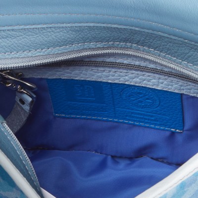 Podstawa torebki wykonana jest ze skóry welurowej w kolorze niebieskim, ozdobionej ciekawym wzorem, co nadaje jej unikalnego i stylowego charakteru. Klapa torebki wykonana jest z gładkiej skóry licowej, a całość uzupełnia niebieski język również wykonany ze skóry licowej, co dodaje jej elegancji.