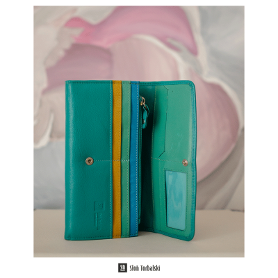 Niebieski skórzany portfel damski z morskim wnętrzem i żółtym detalem to idealne kolorowe akcesorium na co dzień dla odważnych kobiet ceniących styl i funkcjonalność. Wykonany z wysokiej jakości skóry naturalnej, zapewnia nie tylko estetyczny wygląd, ale także trwałość na lata. Portfel damski skórzany Słoń Torbalski oferuje sześć miejsc na karty, dwie przegrody na banknoty oraz dwie wydzielone części na bilon, zamykane na solidny zamek.