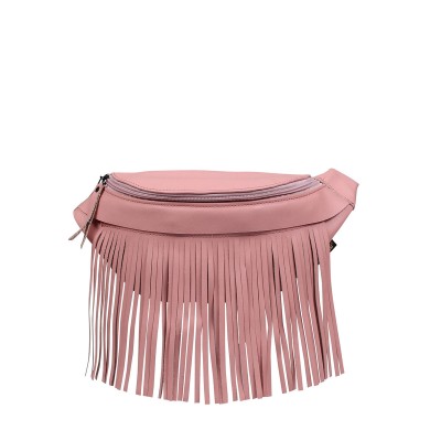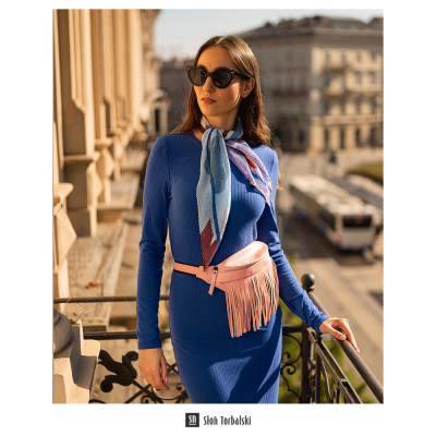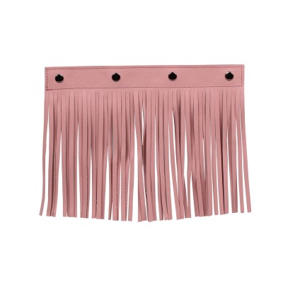 Różowa skórzana nerka damska z wymiennymi wstawkami dopinanymi z frędzlami i z falbanką