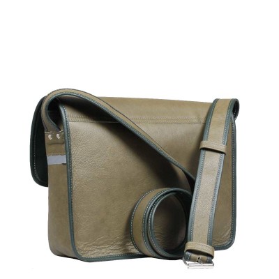 Podstawa torby wykonana jest ze skóry licowej w kolorze oliwkowej zieleni.