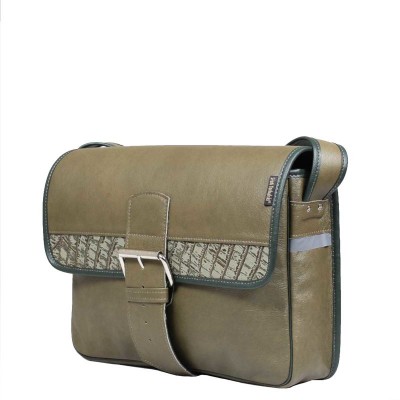 Elegancka skórzana listonoszka Student w kolorze khaki z efektowną aplikacją i klamrą na przodzie. Pojemna i stylowa, idealna na co dzień. Podstawa z oliwkowej skóry licowej, elementy odblaskowe na boku dla zwiększenia bezpieczeństwa. Wnętrze listonoszki z praktycznymi detalami, w tym skórzaną kieszenią na suwak, kieszenią na telefon, miejscem na długopisy, smyczą na klucze i podszewką.
