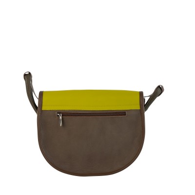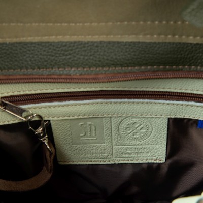Wykonana ręcznie z naturalnej skóry o gładkim wykończeniu, zachwyca elegancją i nowoczesnością. Ciemnozielony korpus został uzupełniony beżowo-szarą lamówką, natomiast klapa w musztardowym odcieniu z elementami ciemnej zieleni stanowi mocny punkt projektu.