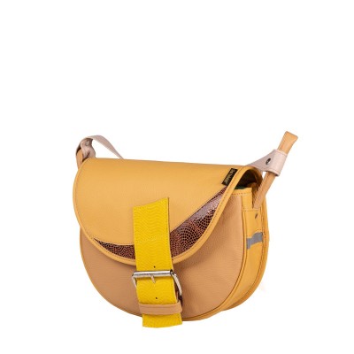 Listonoszka skórzana z naturalnej skóry licowej w beżu i żółci łączy styl z funkcjonalnością. Klapa zamykana na magnes, z ozdobną klamrą, która dodaje charakteru. Wnętrze z kieszenią na zamek, kieszonkami na telefon i długopisy oraz smyczą na klucze zapewnia wygodę. Odblaskowe elementy zwiększają bezpieczeństwo po zmroku.
