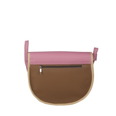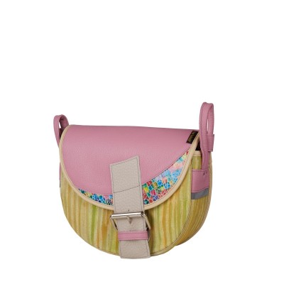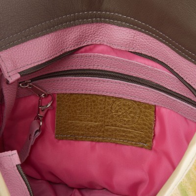Elegancka torebka z wysokiej jakości skóry naturalnej, łącząca welurową podstawę z ozdobnym printem i delikatną różową klapą z mozaikową wstawką. Średniej wielkości model posiada regulowany pasek, komorę główną zamykaną na zamek i magnes, dodatkowe kieszonki wewnątrz i z tyłu, podszewkę oraz odblaski po bokach dla bezpieczeństwa. Idealna na co dzień i do eleganckich stylizacji.