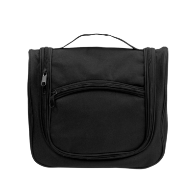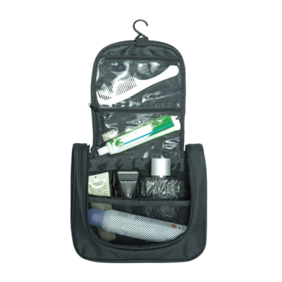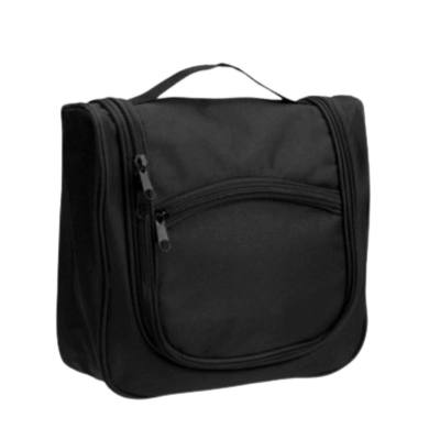 Czarna kosmetyczka podróżna wisząca z haczykiem to funkcjonalny must-have na każdą podróż, zapewniający miejsce na niezbędne akcesoria. Posiada główną komorę, przezroczyste kieszonki, kieszonkę siateczkową oraz gumkę "organizer" do uporządkowanego przechowywania drobiazgów.