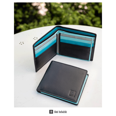 Ten portfel męski to elegancja w minimalistycznym wydaniu. Zewnętrzna czarna skóra kryje wnętrze w odcieniach niebieskiego, co nadaje mu świeży i niebanalny charakter. Portfel skórzany unisex posiada 9 miejsc na karty, 2 kieszonki na drobiazgi, 2 przegrody na banknoty oraz przezroczystą kieszonkę na dokumenty. Doskonały portfel skórzany na karty, banknoty i dokumenty – na co dzień i na specjalne okazje.