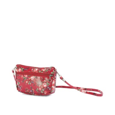 Torebka damska mini w kolorze czerwonym z motywem róż. Model wykonany w 100% z PVC o wymiarach 19x11x5 cm. Na przodzie znajduje się dodatkowa kieszonka, a z tyłu druga kieszonka zamykana na zamek. Wnętrze torebki obszyte jest kwiatową podszewką. Główna komora zamykana na zamek błyskawiczny. Torebka posiada długi, odpinany pasek.