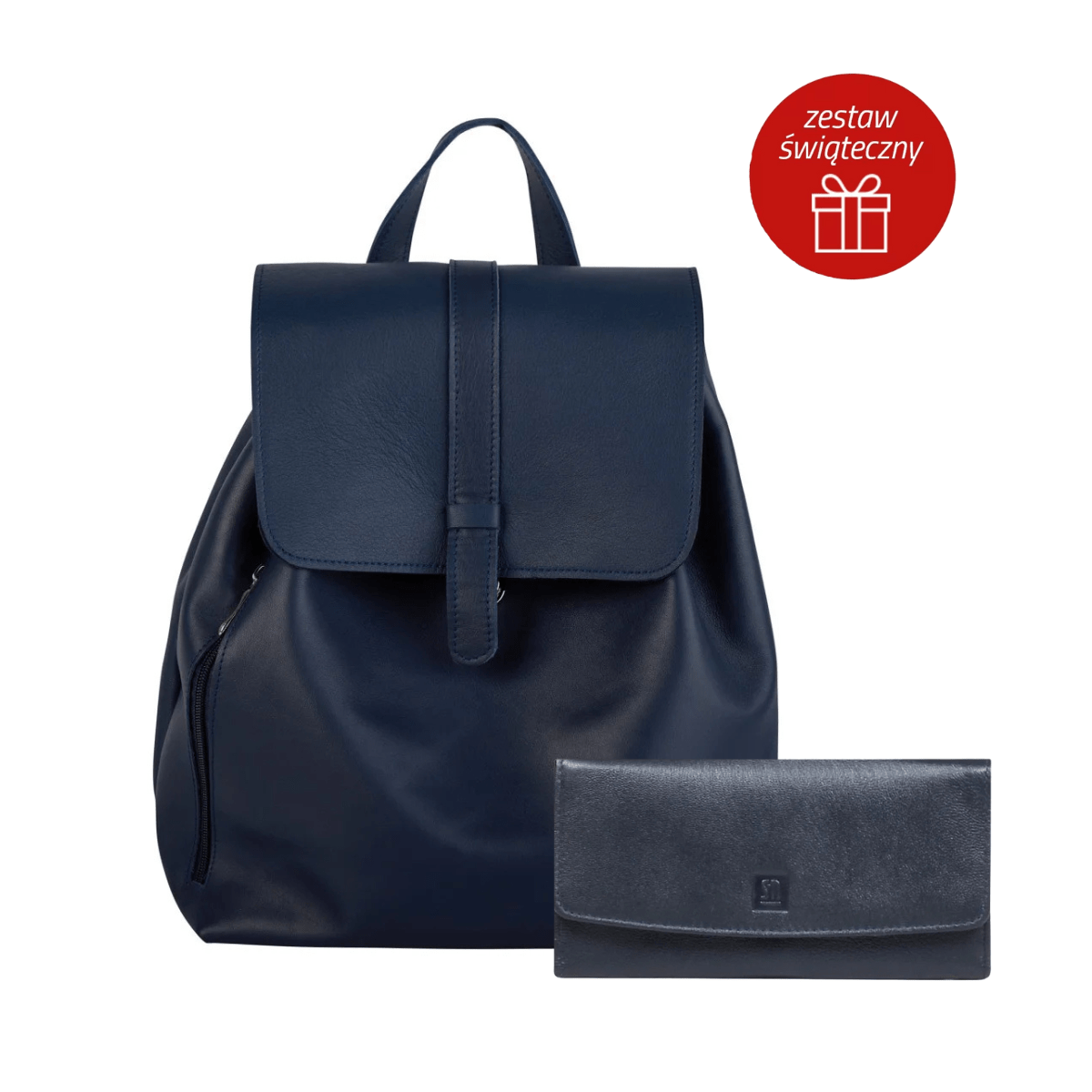 Zestaw prezentowy damski – granatowy plecak i skórzany portfel