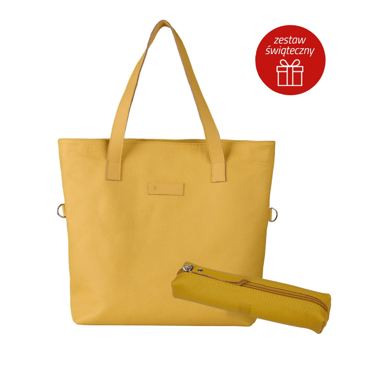 Musztardowa shopperka i dopasowany skórzany piórnik tworzą elegancki i praktyczny zestaw dla kobiet, łączący styl, funkcjonalność i wysoką jakość wykonania – idealny na prezent.