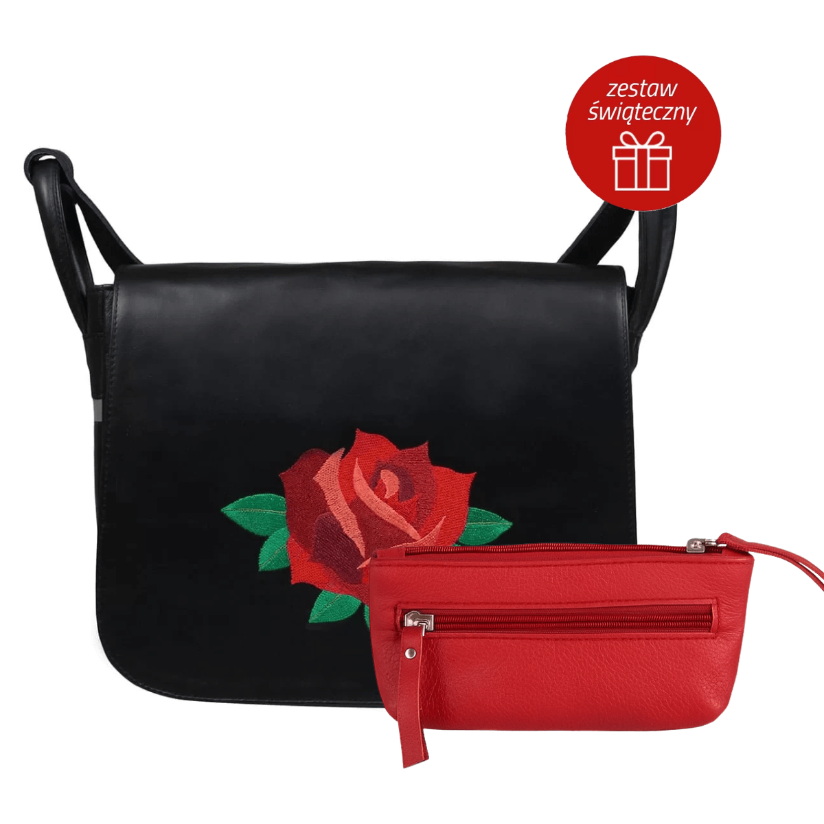 Elegancka czarna listonoszka z haftem „Róża” i czerwone etui na klucze tworzą stylowy, praktyczny zestaw dla kobiet – idealny na prezent, łączący funkcjonalność i wysoki standard wykonania.