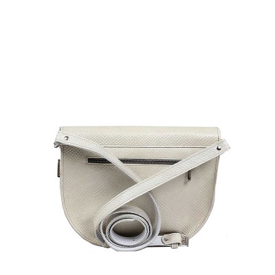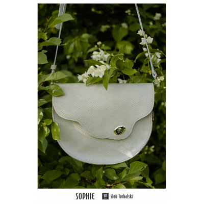 Beżowa torebka listonoszka skórzana Sophie o półokrągłym kształcie. Listonoszka wykonana z naturalnej skóry o fakturze stylizowanej na wężową łuskę. Klapa zamykana na metalową przekrętkę. Z tyłu kieszeń na suwak.Wnętrze: kieszeń na suwak, kieszonka wielkości karty oraz smycz na klucze. Kompaktowa w rozmiarze, funkcjonalna torebka na ramię do codziennego użytku.