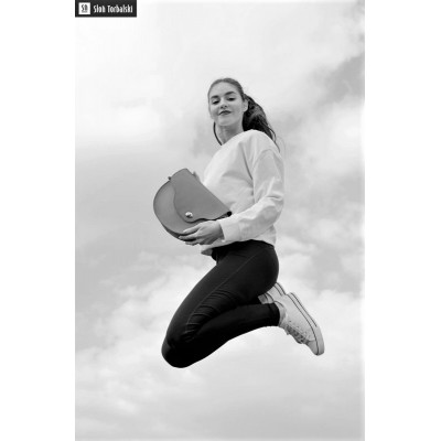 Mała skórzana torebka z paskiem o półokrągłym kształcie.