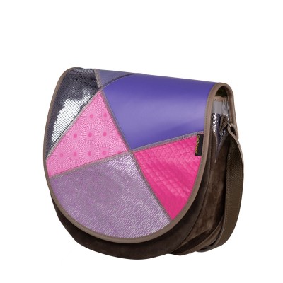 Kolorystyka: klapa – patchwork różowo-fioletowy; podstawa – przód brązowy welur, tył beżowa skóra