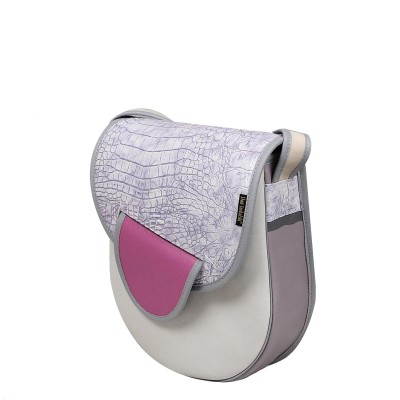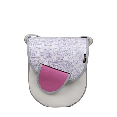 Brązowa półokrągła torebka damska z paskiem - City Light. Podstawa torby wykonana jest z białej skóry naturalnej, przód z różowej skóry naturalnej ,a klapa ze skóry licowej w kolorze jasnego fioletu z wyraźną fakturą. Tył torebki w kolorze szarym. Wygodna kieszeń na suwak jest umiejscowiona pod klapą. Torebka jest średniego rozmiaru - mieści format A5 - oraz posiada regulowany pasek z klamerką. Dodatkowo na boku są naszyte elementy odblaskowe, dzięki temu po zmroku możesz czuć się bezpieczniej. W środku znajduje się kieszonka na telefon, podszewka, kieszeń na suwak, kieszonka na bilet oraz smycz na klucze.