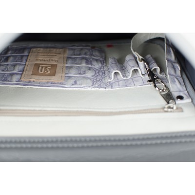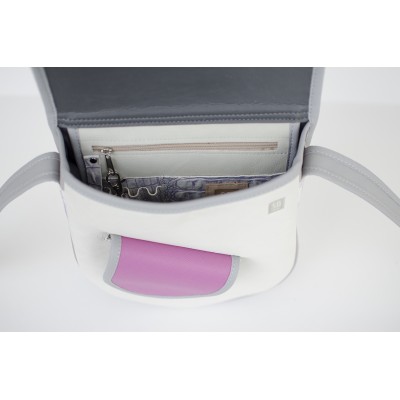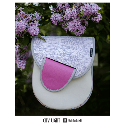 Beżowa półokrągła torebka City Light to lekka i stylowa propozycja o średnim rozmiarze, mieszcząca format A5. Łączy białą, różową i szarą skórę naturalną z klapą w jasnym fiolecie o wyrazistej fakturze. Pod klapą znajduje się praktyczna kieszeń na suwak, a regulowany pasek i odblaskowe elementy zwiększają wygodę oraz bezpieczeństwo po zmroku. W środku: podszewka, kieszeń na suwak, kieszonka na telefon i bilet oraz smycz na klucze. Idealna na co dzień i do miejskich stylizacji.