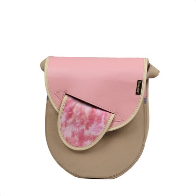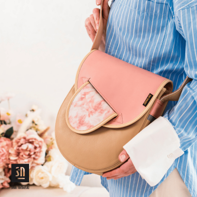Torebka posiada beżową podstawę ze skóry naturalnej oraz różową klapę, tworząc harmonijne połączenie kolorów. Zapięcie na ozdobny język przewlekany przez klapę z naturalnej skóry ozdobnej z różowym motywem dodaje jej niezwykłego uroku.