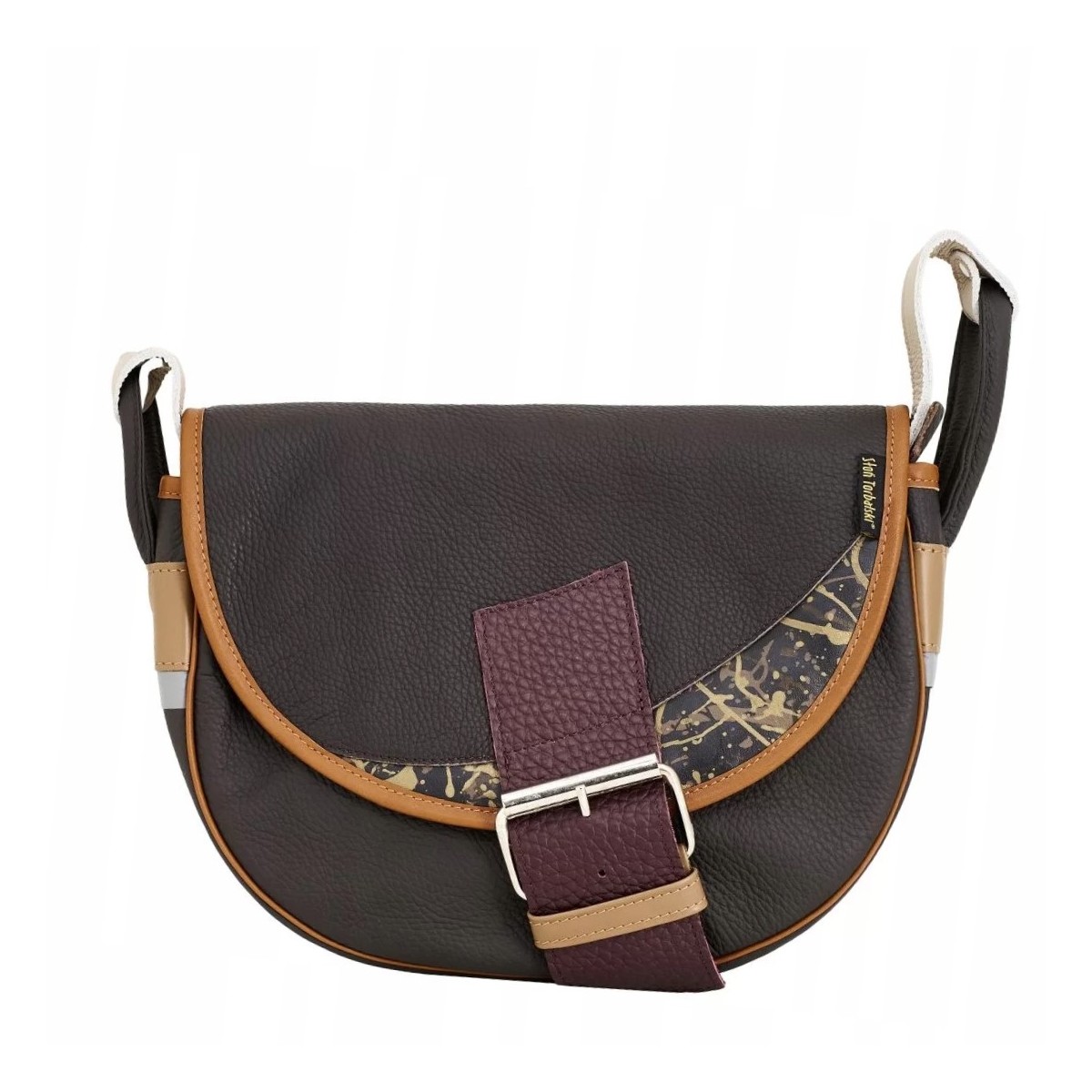Ciemny kolor popielaty stanowi podstawę oraz tył torebki. Powagę przełamuje jednak klapa na której znajdują się wzory w złotym odcieniu, imitujące rozlaną farbę oraz żółta wstawka przypominająca plecionkę. Wewnętrzna strona klapy jest złota, a całość zwieńcza brązowy pasek z klamrą.