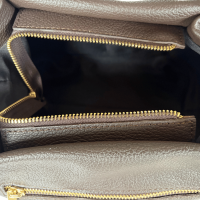 Wszystkie elementy metalowe, takie jak zamki, okucia i karabińczyki, wykonane są w eleganckim złotym kolorze, co podkreśla luksusowy charakter torebki.