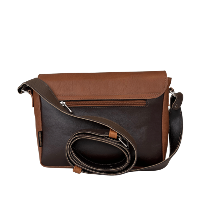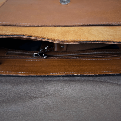 Główna komora torebki zabezpieczona jest zamkiem w kolorze camelowym, dzięki czemu zawartość pozostaje bezpieczna. Tył torebki wykonano z gładkiej skóry licowej w kolorze gorzkiej czekolady i wyposażono w praktyczną kieszeń zapinaną na zamek. Pod klapą znajduje się dodatkowa, naszyta kieszeń w kolorze camelowym, która ułatwia organizację codziennych drobiazgów.