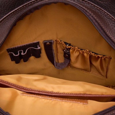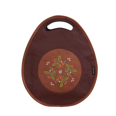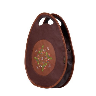 Brązowa torebka Jagoda o zaokrąglonym kształcie łączy funkcje torebki i plecaka po przepięciu paska. Średniej wielkości mieści format A5 i posiada wygodny uchwyt oraz regulowany skórzany pasek. Z przodu ozdobna wstawka z haftem FOLK nadaje jej charakteru. Wnętrze wyposażono w dużą otwartą kieszeń, kieszeń na suwak, miejsce na drobiazgi, trzy miejsca na długopisy, smycz na klucze oraz podszewkę. Jest praktyczna, funkcjonalna i idealna do codziennego użytku.