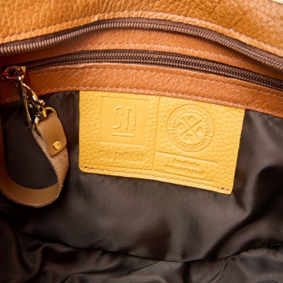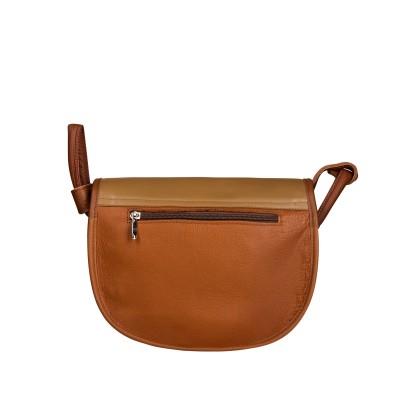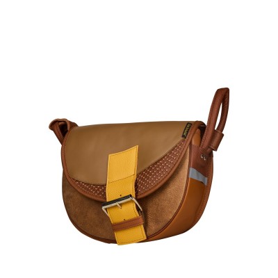 Freshman Mini to półokrągła skórzana torebka damska w odcieniach camel i cappuccino. Klapa z ozdobną wstawką w kształcie półksiężyca i żółtym paskiem dodaje charakteru, a magnetyczne zapięcie i zamek w głównej komorze zapewniają bezpieczeństwo. Regulowany pasek, odblaskowe detale po bokach i tylna kieszeń czynią torebkę skórzaną wygodną na co dzień.