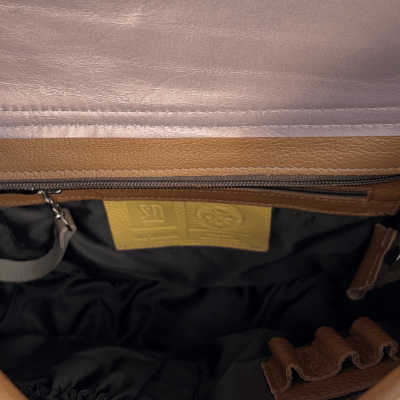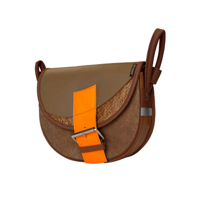 Front z welurowego nubuku harmonijnie współgra z bokami i tyłem ze skóry licowej, a klapa w odcieniu jasnego brązu (cappuccino) została uzupełniona efektowną wstawką w kształcie półksiężyca w dwóch tonacjach camelu i beżu. Wyraziste, intensywnie pomarańczowe zapięcie z metalową, srebrną klamrą dodaje charakteru, pod którym ukryto magnetyczne zapięcie.