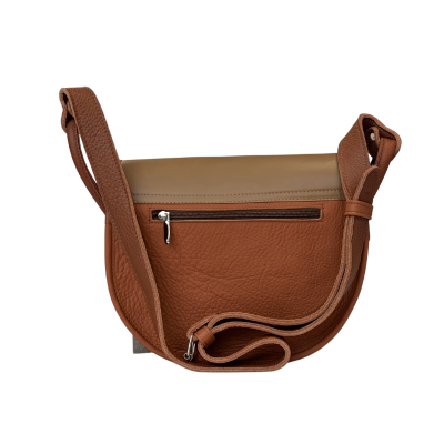 Freshman Mini to stylowa, półokrągła listonoszka wykonana z naturalnej skóry, która łączy klasyczne odcienie karmelu, camelu i beżu z nowoczesnym pomarańczowym akcentem.