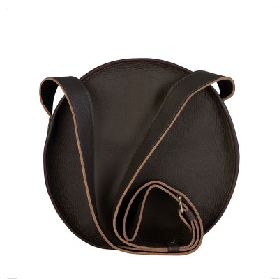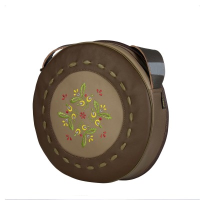Okrągła torebka skórzana w kolorach brązu i beżu z dekoracyjnym haftem kwiatowym. Wyposażona w długi, szeroki pasek (150 cm) z odblaskami dla bezpieczeństwa po zmroku. Wnętrze zawiera kieszeń na zamek, kieszeń otwartą, smyczkę na klucze oraz miejsce na długopisy. Wymiary: 30 x 7 cm, mieści format A5. Idealna do pracy, szkoły i na wycieczki, dodając stylu każdej stylizacji.