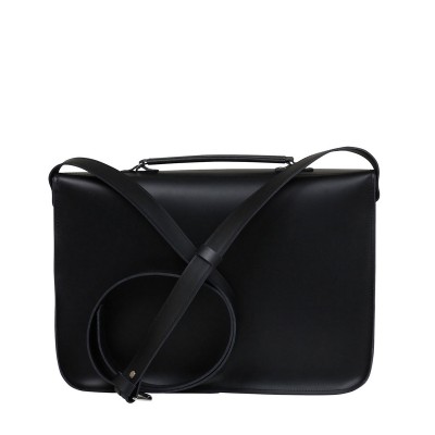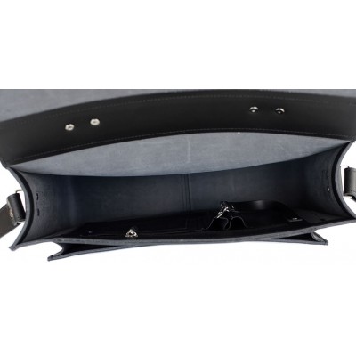 Stylowa i funkcjonalna torebka wykonana z czarnej skóry licowej z ozdobnymi wstawkami. W środku praktyczne kieszonki na suwak, telefon, kartę/bilet i smycz na klucze. Pod klapą dodatkowa bezpieczna kieszeń. Regulowany pasek do 152 cm. Średni rozmiar – mieści format A5.
