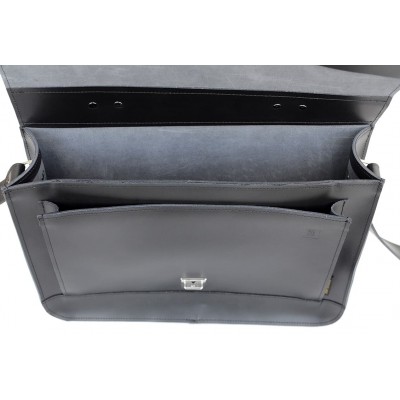 Średniej wielkości torebka z ciemnoszarej skóry licowej ze stonowanymi wstawkami, idealna dla miłośników minimalistycznego designu. Mieści format A5, posiada praktyczne kieszonki wewnątrz i dodatkową kieszeń pod klapą. Regulowany pasek do 150 cm i zapięcie na magnes zapewniają komfort i funkcjonalność.