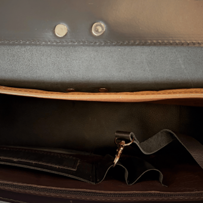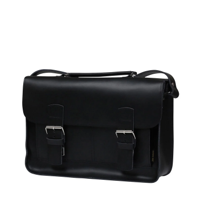 Pojemna torba uniseks mieści format A4 (wymiary: 35 × 24 × 9 cm). Pod klapą znajdują się dwie praktyczne kieszenie, a zamknięcie torby stanowią zatrzaski teczkowe typu tik-tak, ukryte pod licowymi językami z klamerkami.