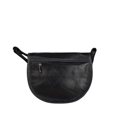 Baza torebki została uszyta z czarnej skóry naturalnej — gładkiej w górnej części i z delikatną, groszkową fakturą w dolnej partii. Klapa wykonana jest z miękkiej, czarnej skóry licowej, a jej design wzbogaca ozdobna granatowa wstawka o strukturze drobnych heksagonów, która wprowadza subtelną grę faktur. Na froncie umieszczono szeroki, intensywnie niebieski pasek z ozdobną, czarną klamrą — to charakterystyczny element linii Freshman Mini, dodający torebce wyrazistego, nowoczesnego charakteru.