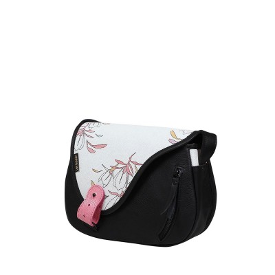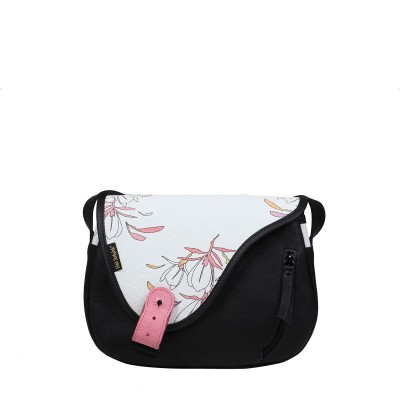 Średniej wielkości torebka damska handmade ze skóry naturalnej. Podstawa torebki wykonana z czarnej skóry licowej. Komora główna mieści format A5 i jest zamykana na suwak, dzięki czemu zawartość jest bardzo dobrze zabezpieczona. Klapa jest wykonana ze skóry dekoracyjnej w kolorze białym. Na przodzie torebki znajduje się zasuwana kieszeń na drobiazgi. Całość uzupełnia nietypowe zapięcie: różowy język ze skóry naturalnej z bolczykiem. Wymiary: 27,5x21x8 cm.