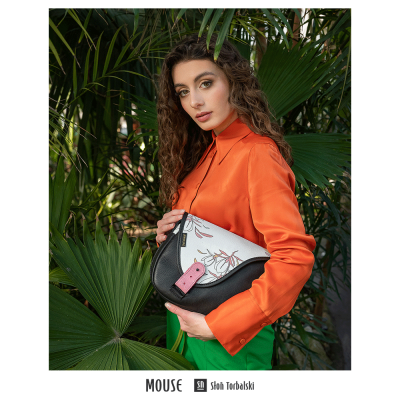 Listonoszka skórzana Mouse wykonana z czarnej licowej skóry z kontrastową białą klapą i różowym językiem z bolczykiem. Zamykana na suwak, z przednią kieszenią na drobiazgi. Idealna do miejskich stylizacji – praktyczna, lekka i wyjątkowo stylowa.