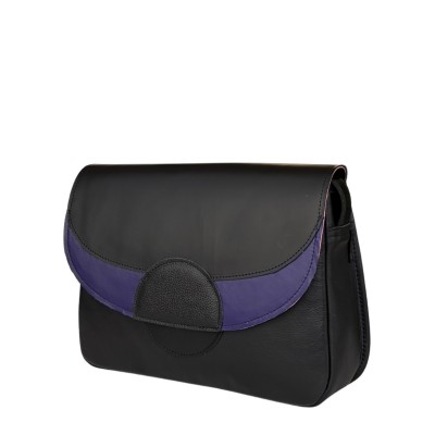 Torebka Rainbow to średniej wielkości skórzana torebka damska, wykonana z miękkiej, gładkiej skóry w kolorze czarnym. Komora główna zamyka się na czarny zamek oraz dodatkowo na klapę z magnesem. Klapa jest dwukolorowa – większa część wykonana jest z gładkiej czarnej skóry, natomiast na dole znajduje się półksiężyc w kolorze fioletowym z gładkiej skóry oraz półkole w kolorze czarnym o fakturze groszkowej.
