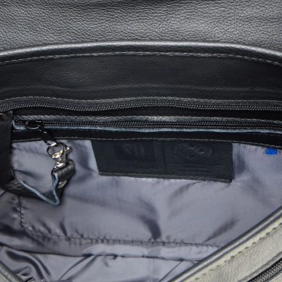 Wnętrze torebki zawiera kieszeń zapinaną na zamek, skórzaną smycz na klucze, kieszeń na telefon, kieszeń na bilet miesięczny lub kartę oraz czarną podszewkę. Komora główna mieści dokumenty w formacie A5.
