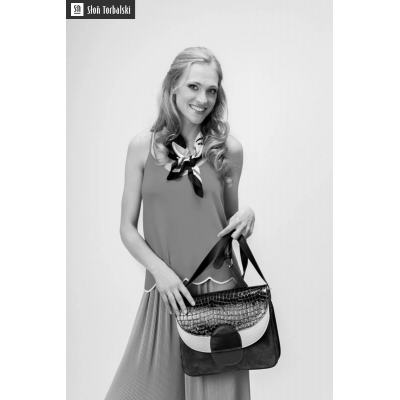Torebka posiada długi, sztywny pasek w kolorze czarnym. Na froncie znajduje się szeroka kieszeń zapinana na czarny zamek, ukryta pod klapą. Model jest na tyle usztywniony, że można go postawić.