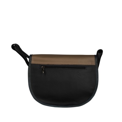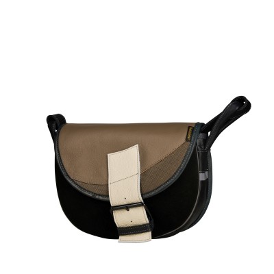 Klapę wykonano z ciemnobeżowej skóry groszkowej, wzbogaconej o dekoracyjną wstawkę w kształcie półksiężyca w odcieniu brązu, z pięknie tłoczonym beżowo-brązowym wzorem. Klapa zapinana jest na magnes ukryty pod paskiem w kolorze ecru, który zdobi czarna, ozdobna klamra — charakterystyczny akcent tej linii.