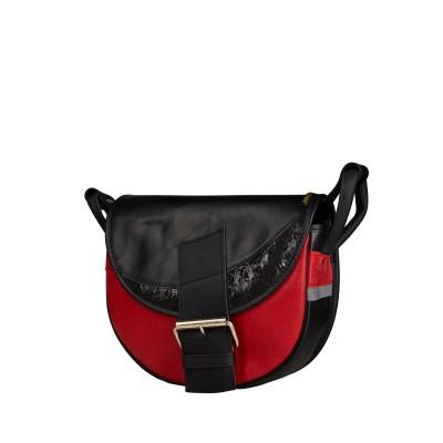 Freshman Mini to półokrągła torebka wykonana ze skóry naturalnej. Front wykonany jest z czerwonego zamszu, natomiast tył i boki – z gładkiej, miękkiej czarnej skóry.