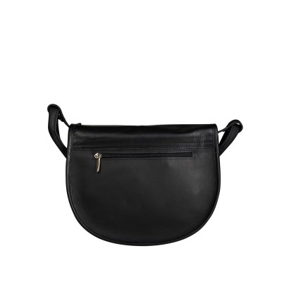 Torebka posiada klapę w kolorze czarnym ze skóry gładkiej, ozdobioną wstawką w kształcie półksiężyca w czarnym, lekko mieniącym się odcieniu z fakturą tłoczonych, asymetrycznych wzorów. Klapa zapinana jest na magnes ukryty pod czarnym paskiem z elegancką, srebrną klamrą. Główna komora, znajdująca się pod klapą, zamykana jest na zamek, co zapewnia bezpieczeństwo przechowywanych przedmiotów.
